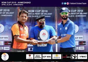 Jatinder Singh hammed a 21 ball 43 to lead Valiant Cricket Team to a one wicket win over rest of Valiant and clinch the T20 BDM Cup 2018.Batting First , Rest of Valiant scored 131 for one , with Former Ranji Trophy player and Rest of Valiant skipper Pratik Mehta blasting unbeaten 91. In reply, Valiant scampered to win, Scoring 132 for nine in 18.4 overs. Jatinder who is the skipper of Valiant ,hit three boundaries and two sixes.